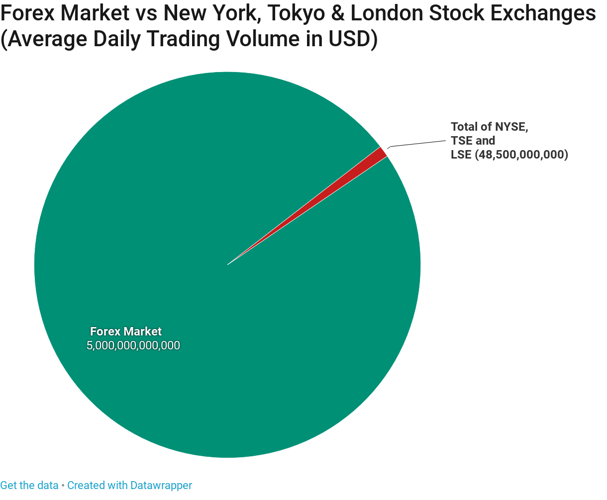 The Forex market is the largest in the world with around $5 trillion average daily trade volume. It dwarfs the daily trade volume of the New York (NYSE), Tokyo (TSE), and London Stock Exchange (LSE) which stands at around $22, $18 and $8 billion respectively. In this article, we will take a look at the top 5 most traded currencies in the world.