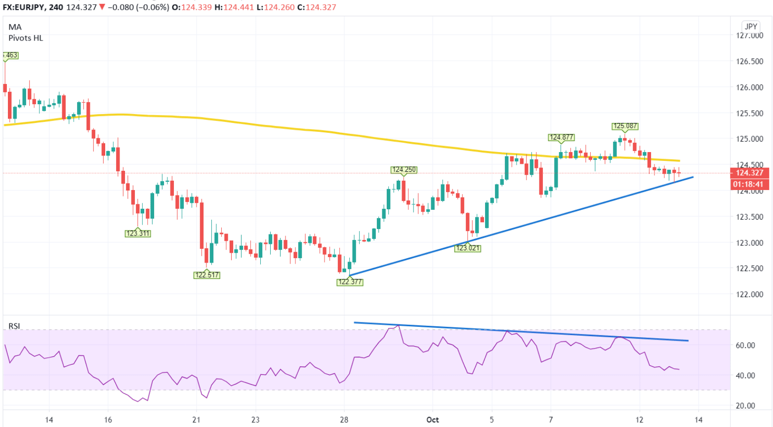 As mentioned earlier, the pair will need to hold above the 124.30 regions to keep within bullish sentiment. Otherwise, we could see EURJPY slip back down to 123.00 and 122.37, respectively.