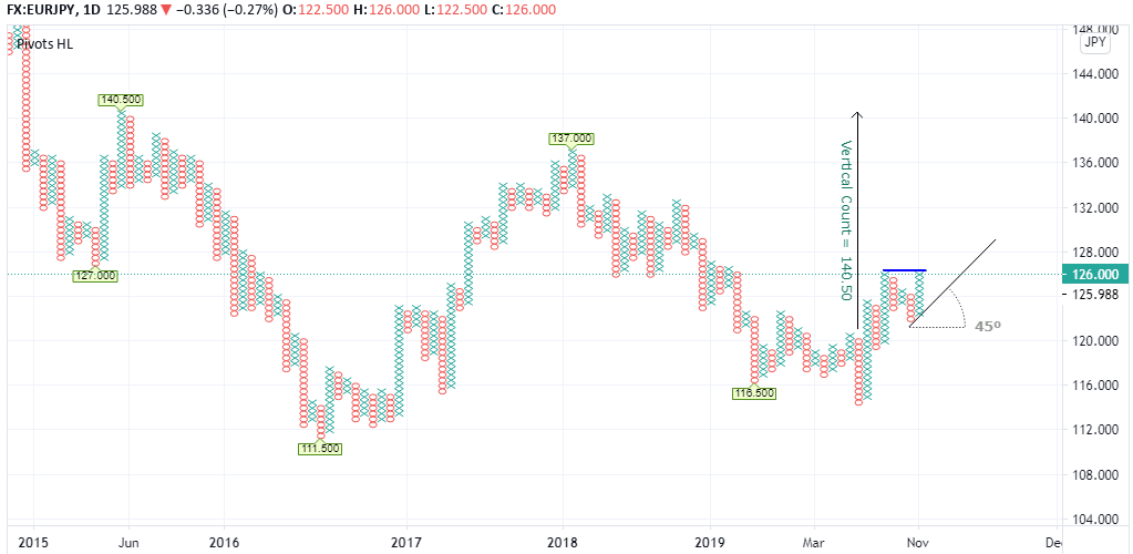 Finally, these are not the only upside targets worth considering. If we carry out a vertical column count from the low of 115.00, an interesting figure emerges. Following a quick calculation of the proceeding column’s range, it results in an upside target of 140.50. This level was an exact high for EURJPY on the point and figure chart back in May 2015. Despite being quite a distance from this price, it’s not unimaginable to think it could journey in this direction given the trend’s current trajectory and volatility in the marketplace. Only time will tell.